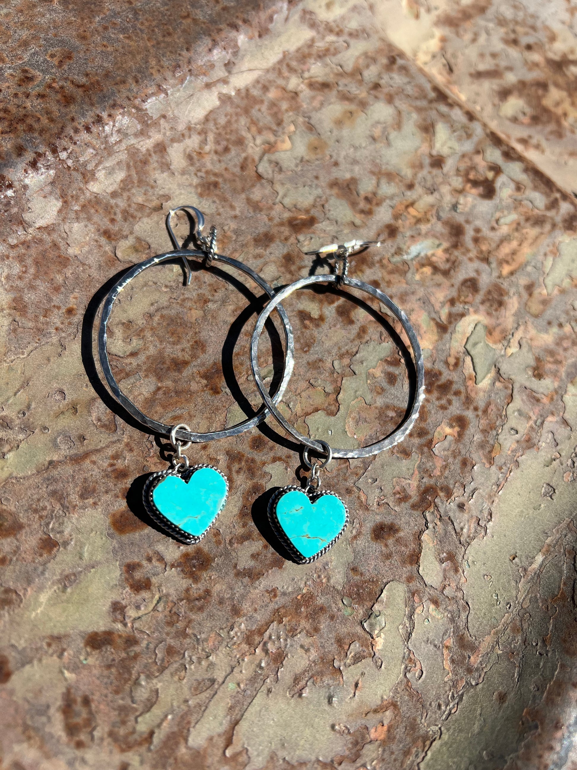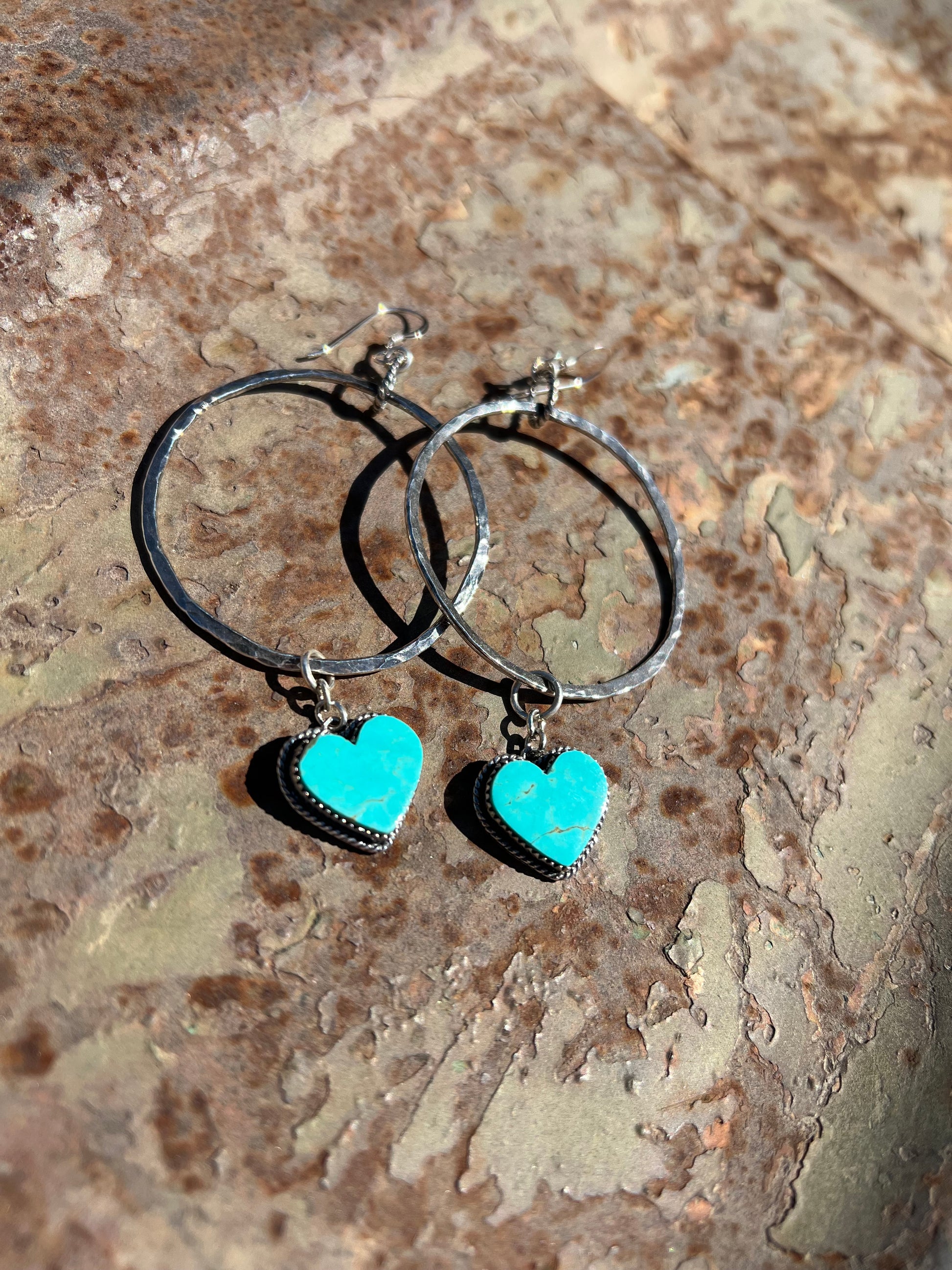 Handmade sterling silver hammer textured hoops with Kingman turquoise hearts