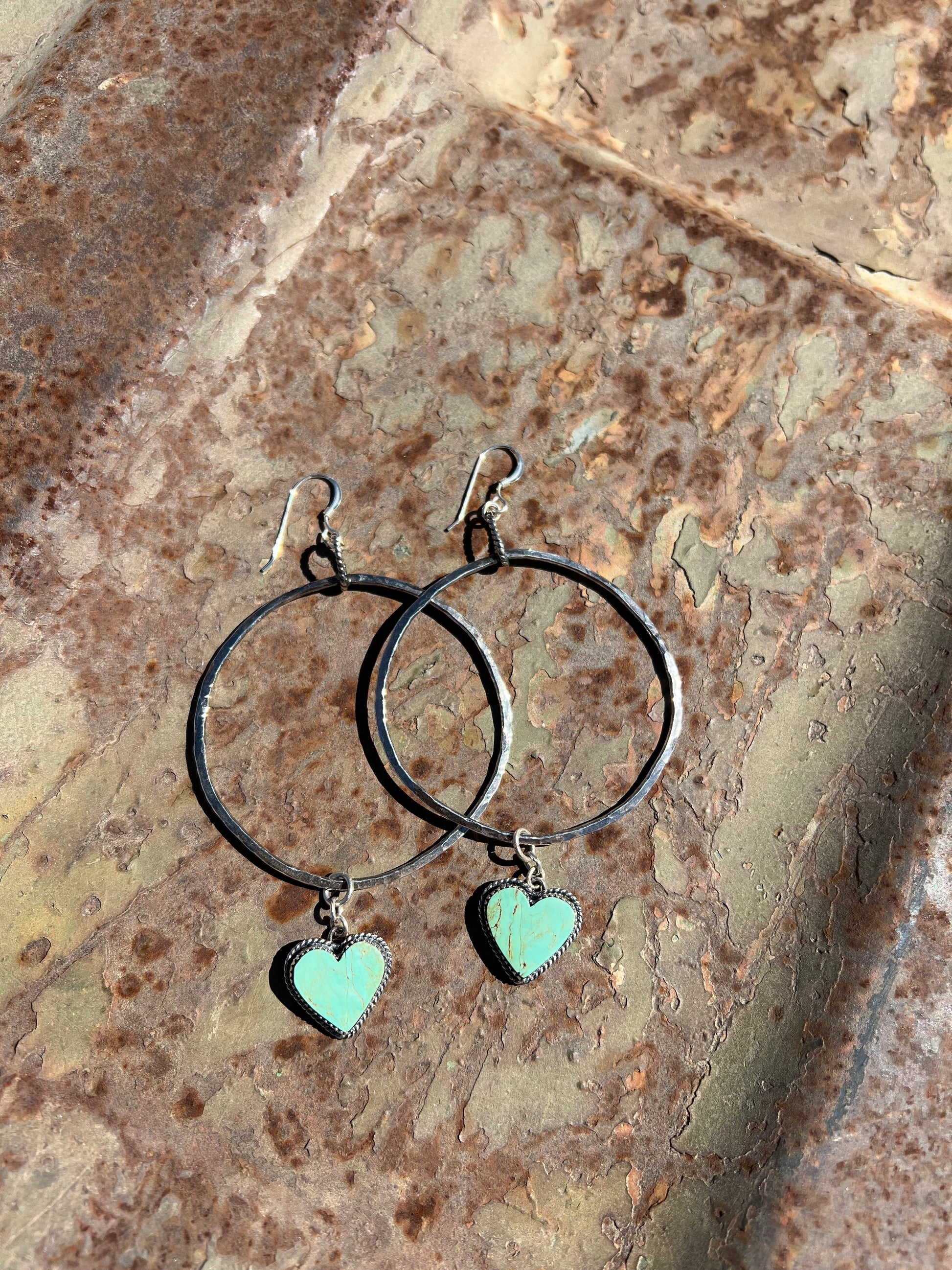 Handmade sterling silver hammer textured hoops in Royston green turquoise.